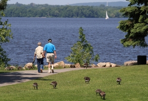 Two recently completed studies characterized E.coli in goose feces found in urban environments. In a Fort Collins, Colorado study, the overall prevalence of pathogenic E. coli in Canada goose feces was found to be 25 (Kullas, et al, 2002). Four general potentially pathogenic E. coli and two virulence factors (the ability to produce disease) were identified. One virulence factor is known to produce severe diarrhea, while the other is associated as a causative agent of infantile meningitis. In this Fort Collins study, researchers also quantified the amount of feces in parks, estimating that a person taking a one-mile walk in a park was likely to physically come in contact, on the bottom of his or her shoes, with 4-8 piles of feces that contained virulence determinants. A second study, a year-long national survey in New York, Wisconsin, Washington, Oregon and California (Clark et al, unpublished) resulted in findings that were similar to the Colorado study. Together, the two studies suggest that Canada goose feces do pose a risk to humans.